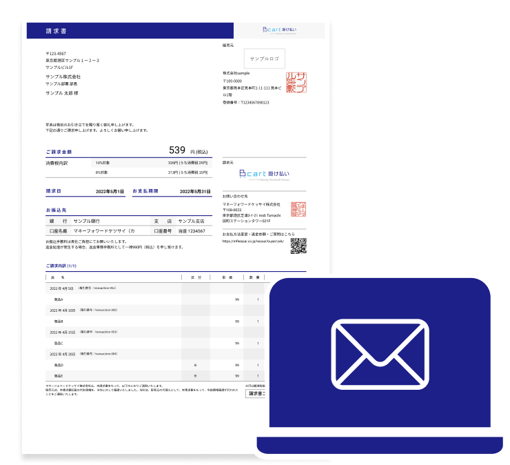販売元が指定した日に送付されます。請求書のpdfファイルをメールに添付します。