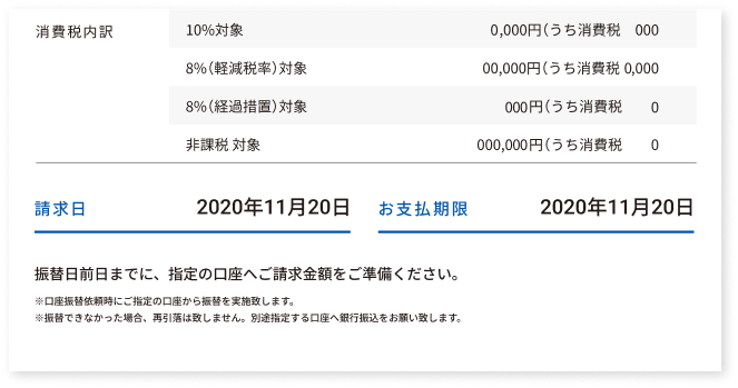 請求書兼口座振替通知書の記載にしたがって指定口座にご準備ください。