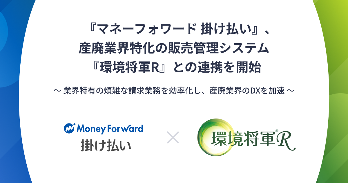 株式会社マネーフォワードのグループ会社であるマネーフォワードケッサイ株式会社は、株式会社JEMS(以下、JEMS)と廃棄物処理・資源リサイクル業界(以下、産廃業界)のDX推進に向けた協業を開始しました。本協業により、JEMSが提供する産廃業界特化型基幹システム『環境将軍R』と、当社の企業間後払い決済・請求代行サービス『マネーフォワード 掛け払い』のAPI連携を実現します。JEMSが長年蓄積してきた現場の業務フローに関する知見と、当社が培ってきた決済インフラを融合し、業界特有の煩雑な請求・入金業務の効率化や未回収リスクの低減、ペーパーレス化の促進など、産廃業界のDX推進を支援します。
